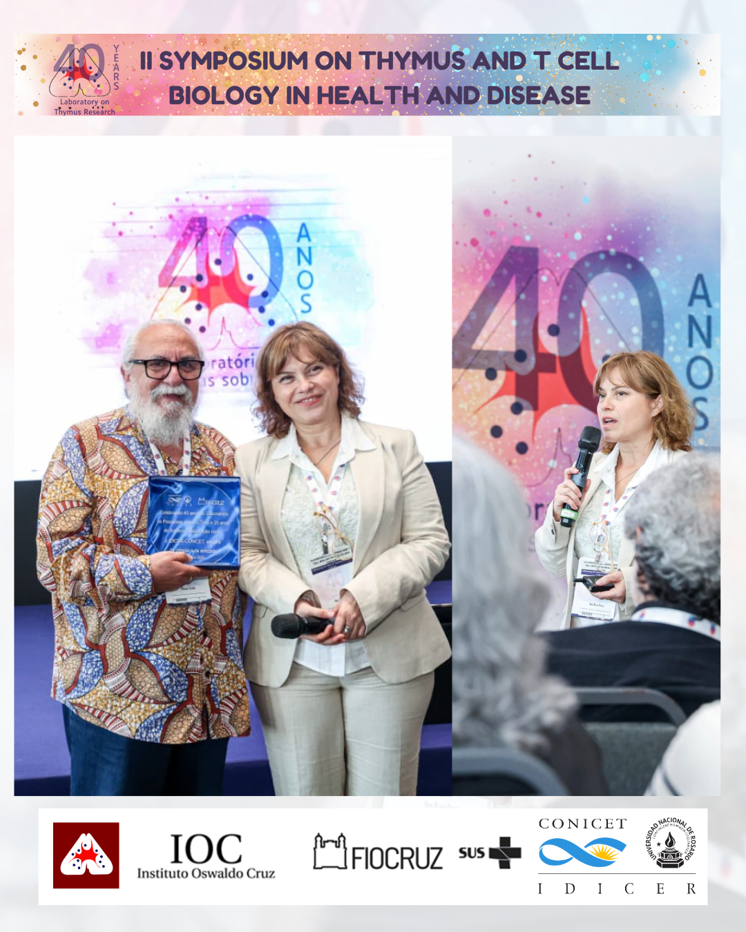 Los días 8 y 9 de septiembre se celebró en Río de Janeiro el II Simposio sobre Timo y Biología de las Células T, organizado por el Laboratorio de Pesquisas sobre o Timo (LPT) de la Fundação Oswaldo Cruz (FIOCRUZ). Durante el evento se conmemoraron además los 40 años del LPT, y tuvimos el honor de entregar un presente a su fundador, el Dr. Wilson Savino. La Dra. Ana Rosa Pérez, directora del IDICER, expuso los principales resultados de 20 años de colaboración entre ambas instituciones en estudios sobre la fisiología del timo y los linfocitos T en la Enfermedad de Chagas.